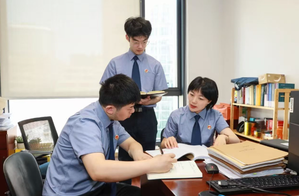 2025年8月,戴慈(右)与办案组成员讨论案件的定性争议。