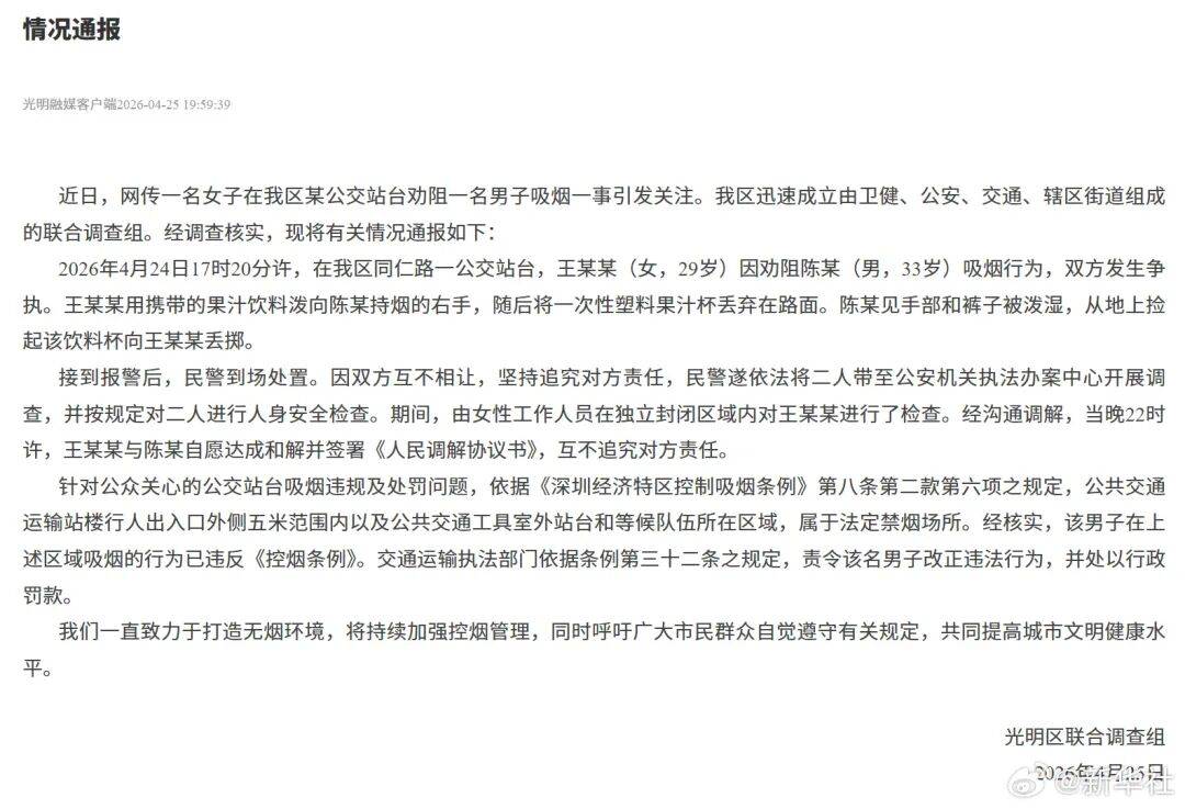 | 本文综合深圳特区报、南方都市报、极目新闻等 近日,深圳一名女子在公交站台发现有人吸烟后上前劝阻,双方随后发生争执,引发舆论广泛关注。 4月25日,光明区联合调查组发布情况通报:民警依法将二人带回调查,并按规定对二人进行人身安全检查,二人达成和解,互不追究对方责任。官方责令抽烟男子改正在法定禁烟场所抽烟的违法行为,并处以行政罚款。 此事在社交媒体上引起广泛关注。其中焦点问题之一,是该男子在站台吸烟该不该处罚?此事的焦点问题之二,是警方的执法是否存在瑕疵? 26日凌晨,知名媒体人胡锡进对此事发表评论,表示“深圳警方有必要对是否真的对该女士做了她所声称的检查,以及这种检查的法律依据是什么做出说明。那对维护深圳警方的形象将产生积极作用”。 深圳特区报记者了解到,民警到场处置,因双方坚持追究对方责任,民警依法将二人带至公安机关执法办案区开展调查。根据规定,为防范可能发生的意外,涉事人员进入公安机关执法办案区,需接受人身安全检查。对王某某,警方安排了女性工作人员在独立封闭区域内对其进行了检查。记者向法律界人士咨询,警方执法过程合法合规。 据警方有关负责人介绍,关于民警曾表示“公交站应不属于禁烟范围”,在当事人提出质疑、民警查询相关法规后发现错误,已当场纠正。 4月26日,极目新闻记者注意到,有部分网友对官方通报表示质疑,有人甚至实名挂出“光明区某某派出所烟男”的名单,对其进行“人肉开盒”。 26日下午,微博社区观察员官方账号“围脖侠”回应:“经核实,所示违规用户鼓吹‘开盒挂人’等违规行为作为威胁,严重违反社区公约有关规定,已受到关闭账号的处置。” 市民是否有权“浇灭”他人香烟?有律师解读称,“有理不代表可以任意行事”,市民可善意提醒或留证举报,切勿私力强制制止。 针对此类引发舆论关注的公共事件,专家指出,当事人在公共平台发声应保证内容真实客观。光明区迅速成立联合调查组,公开透明处置事件,还原事件过程,并向社会通报,及时回应了各方关切,维护了公众知情权与社会公平正义。 官方通报:涉事双方达成和解 男子违反控烟条例被罚款 4月25日,深圳市光明区发布通报: 近日,网传一名女子在我区某公交站台劝阻一名男子吸烟一事引发关注。我区迅速成立由卫健、公安、交通、辖区街道组成的联合调查组。经调查核实,现将有关情况通报如下: 2026年4月24日17时20分许,在我区同仁路一公交站台,王某某(女,29岁)因劝阻陈某(男,33岁)吸烟行为,双方发生争执。王某某用携带的果汁饮料泼向陈某持烟的右手,随后将一次性塑料果汁杯丢弃在路面。陈某见手部和裤子被泼湿,从地上捡起该饮料杯向王某某丢掷。 接到报警后,民警到场处置。因双方互不相让,坚持追究对方责任,民警遂依法将二人带至公安机关执法办案中心开展调查,并按规定对二人进行人身安全检查。期间,由女性工作人员在独立封闭区域内对王某某进行了检查。经沟通调解,当晚22时许,王某某与陈某自愿达成和解并签署《人民调解协议书》,互不追究对方责任。 针对公众关心的公交站台吸烟违规及处罚问题,依据《深圳经济特区控制吸烟条例》第八条第二款第六项之规定,公共交通运输站楼行人出入口外侧五米范围内以及公共交通工具室外站台和等候队伍所在区域,属于法定禁烟场所。经核实,该男子在上述区域吸烟的行为已违反《控烟条例》。交通运输执法部门依据条例第三十二条之规定,责令该名男子改正违法行为,并处以行政罚款。 我们一直致力于打造无烟环境,将持续加强控烟管理,同时呼吁广大市民群众自觉遵守有关规定,共同提高城市文明健康水平。