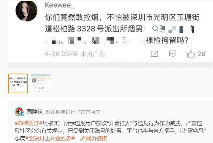 王女士随后报警,双方被带到玉塘派出所做笔录。 记者从警方获悉,接到报警后,民警迅速赶到现场处置,因双方均坚持追究对方责任,警方遂依法将二人带至公安机关进一步调查,并按照执法程序对二人进行人身安全检查。在调查过程中,双方均表达了和解意愿。当晚10时许,在警方协调下,王某某与陈某自愿达成和解,并签署《人民调解协议书》,互不追究责任。 据警方有关负责人介绍,关于民警曾表示“公交站应不属于禁烟范围”,在当事人提出质疑、民警查询相关法规后发现错误,已当场纠正。 此事在社交媒体上引起广泛关注。记者留意到,其中焦点问题之一,是该男子在站台吸烟该不该处罚? 记者了解到,4月25日上午,深圳市交通运输局光明分局执法支队根据派出所提供的线索,对陈某在公交站台吸烟的违法行为展开核查。 经调查,陈某承认其在禁止吸烟的公交站台吸烟的事实。执法人员认定其行为违反深圳市有关条例,执法部门已依据条例依法对陈某处以50元罚款,并当场执行。 针对公众关心的公交站台吸烟违规及处罚问题,深圳市交通运输局光明分局相关负责人向记者表示,依据《深圳经济特区控制吸烟条例》第八条第二款第六项规定,公共交通运输站楼行人出入口外侧五米范围内以及公共交通工具室外站台和等候队伍所在区域属于法定禁烟场所。经执法部门核实,陈某在上述区域吸烟的行为已违反《控烟条例》。 记者留意到,此事的焦点问题之二,是警方的执法是否存在瑕疵?记者了解到,事发后,光明区迅速成立由卫健、公安、交通、辖区街道组成的联合调查组。 记者了解到,民警到场处置,因双方坚持追究对方责任,民警依法将二人带至公安机关执法办案区开展调查。根据规定,为防范可能发生的意外,涉事人员进入公安机关执法办案区,需接受人身安全检查。对王某某,警方安排了女性工作人员在独立封闭区域内对其进行了检查。记者向法律界人士咨询,警方执法过程合法合规。 网友开盒挂出“深圳派出所烟男”名单 微博:严重违规,已关闭账号 4月26日,极目新闻记者注意到,有部分网友对官方通报表示质疑,有人甚至实名挂出“光明区某某派出所烟男孙某某、钟某某、陶某、魏某某、王某某”的名单,对其进行“人肉开盒”。记者查询发现,上述名单中的人,系光明区政府官网公布的光明区公安分局领导。
