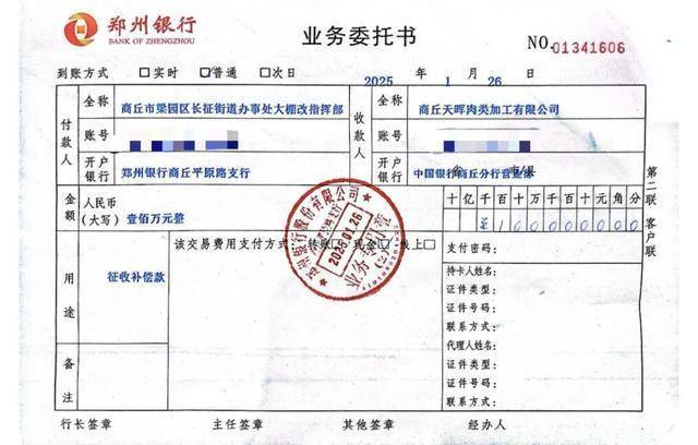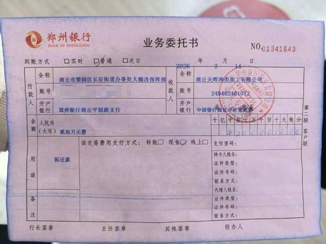 图为业务委托书 “厂区拆迁后,政府财政解决了人员安置费、物资设备搬迁费等开支,但1.5亿元的补偿款始终未解决。”朱某说,2023年1月,长征街道办大棚改指挥部转账200万元征收补偿款;2025年1月,转账100万元征收补偿款;2026年2月14日,转账200万元,“至今,我们仅收到500万元补偿款。” 难以破局—— “雨润正在债务重整,压力巨大” 梁园区政府:未列入债务系统 公开资料显示,雨润集团是中国肉制品龙头企业。2015年以来,雨润集团接连遭受金融债务违约、诉讼仲裁、资产查封冻结等打击,企业发展陷入困境。2020年至2022年,雨润集团在江苏省政府的支持下,开启了债务重整,对逾800亿元的债务本金及利息全覆盖。 2023年底,雨润集团向梁园区政府发函,希望有关部门归还补偿款,帮助企业度过困难时期。