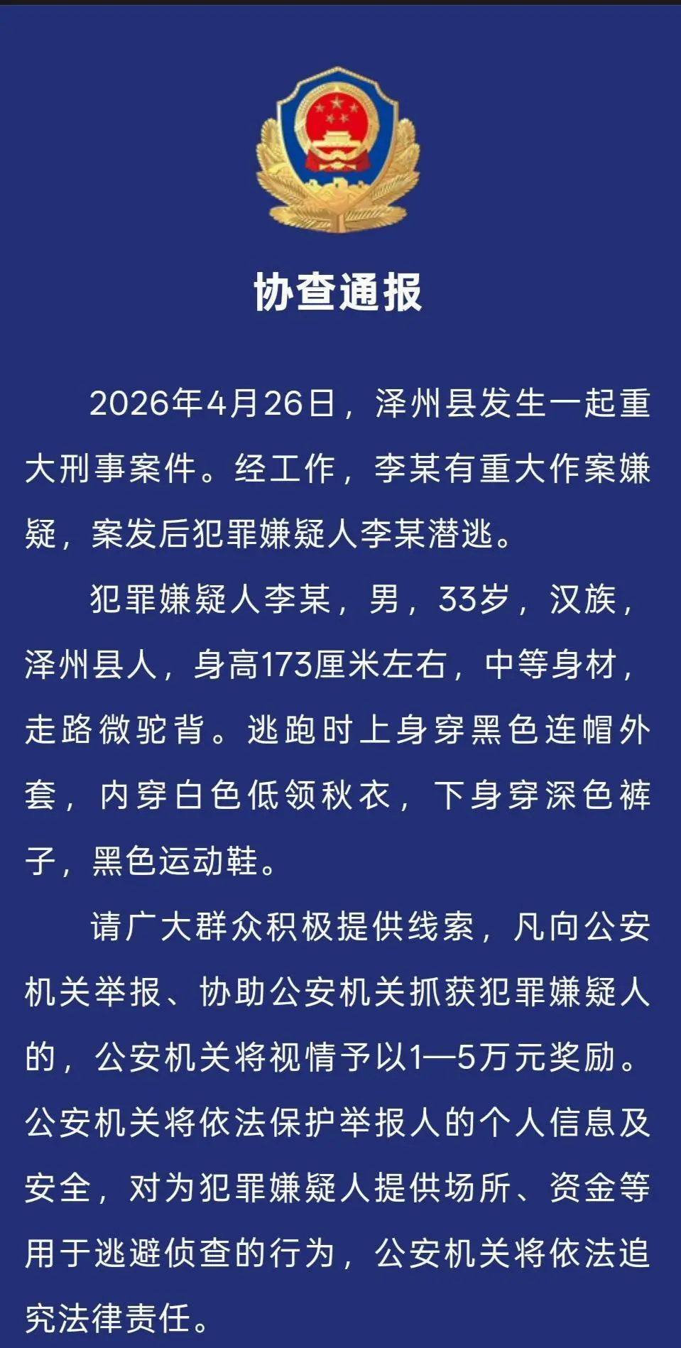 | 极目新闻记者 王鹏 4月27日,据平安泽州消息:2026年4月26日,泽州县发生一起重大刑事案件。经工作,李某有重大作案嫌疑,案发后犯罪嫌疑人李某潜逃。 泽州县公安局发布协查通报 犯罪嫌疑人李某,男,33岁,汉族,泽州县人,身高173厘米左右,中等身材,走路微驼背。逃跑时上身穿黑色连帽外套,内穿白色低领秋衣,下身穿深色裤子,黑色运动鞋。请广大群众积极提供线索,凡向公安机关举报、协助公安机关抓获犯罪嫌疑人的,公安机关将视情予以1万元到5万元奖励。公安机关将依法保护举报人的个人信息及安全,对为犯罪嫌疑人提供场所、资金等用于逃避侦查的行为,公安机关将依法追究法律责任。