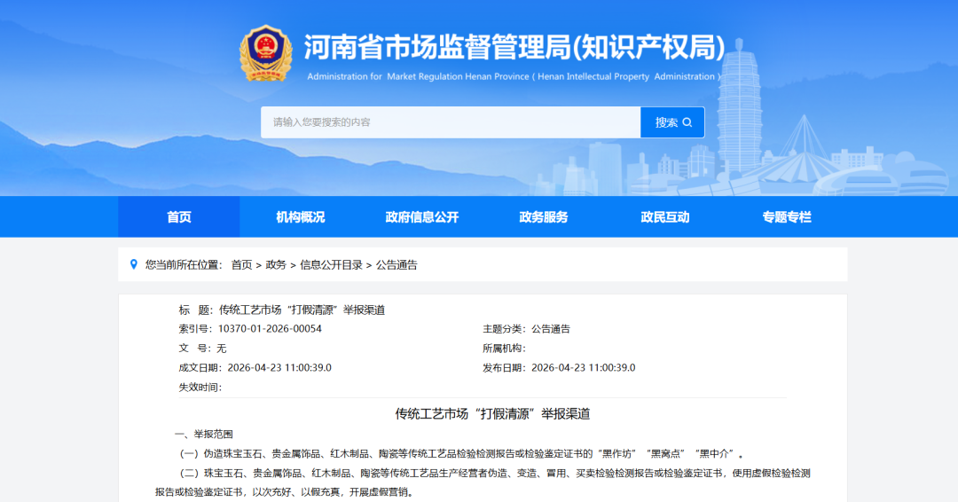 4月23日,河南省市场监督管理局发布消息,开通“打假清源”举报渠道,严厉打击传统工艺市场中的虚假行为。